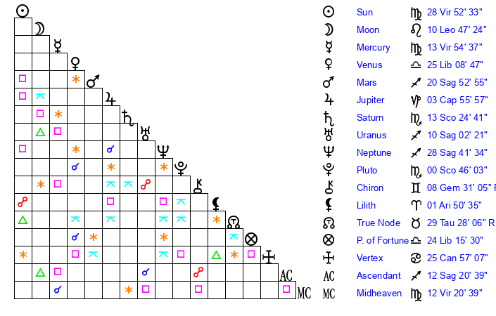 | Neptune | 28 Sagittarius 41 | 0 Aries 47 | 29 Sagittarius 24 |