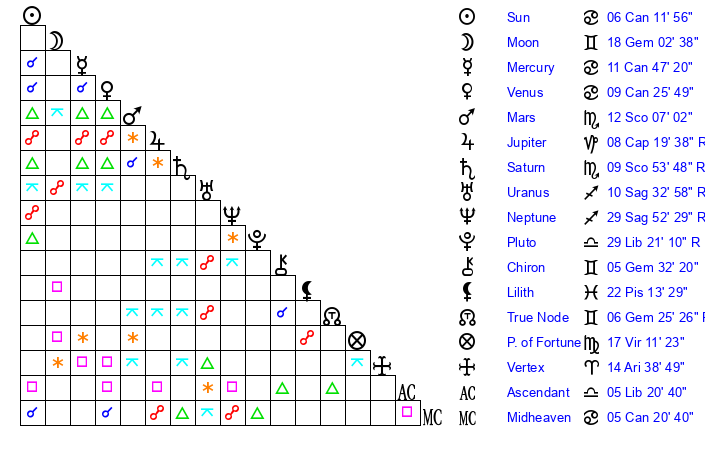 Moon | 18 Gemini 5 | 6 Leo 16 | 29 Sagittarius 42 |