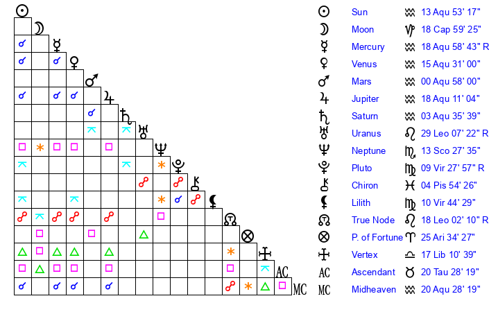 | Sun | 13 Aquarius 53 | 14 Aquarius 37 | 16 Aries 54 |