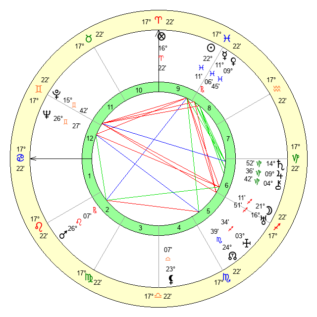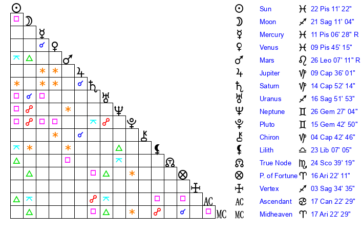 | Sun | 22 Pisces 11 | 23 Pisces 7 | 22 Cancer 13 |