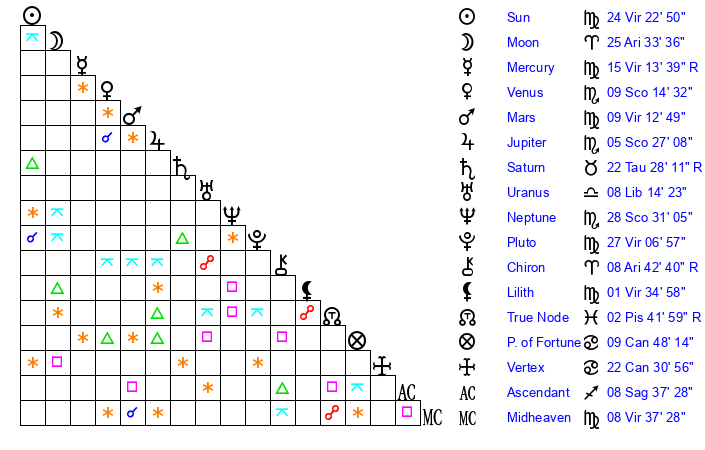 | Sun | 24 Virgo 23 | 25 Virgo 3 | 18 Scorpio 53 |