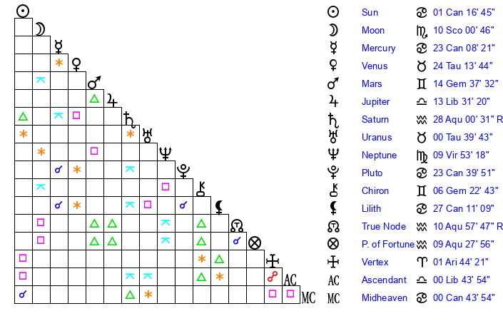 | Moon | 9 Scorpio 55 | 4 Gemini 58 | 18 Pisces 55 |