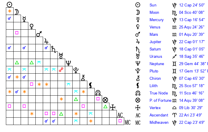 | Moon | 4 Scorpio 40 | 0 Pisces 52 | 27 Aries 56 |