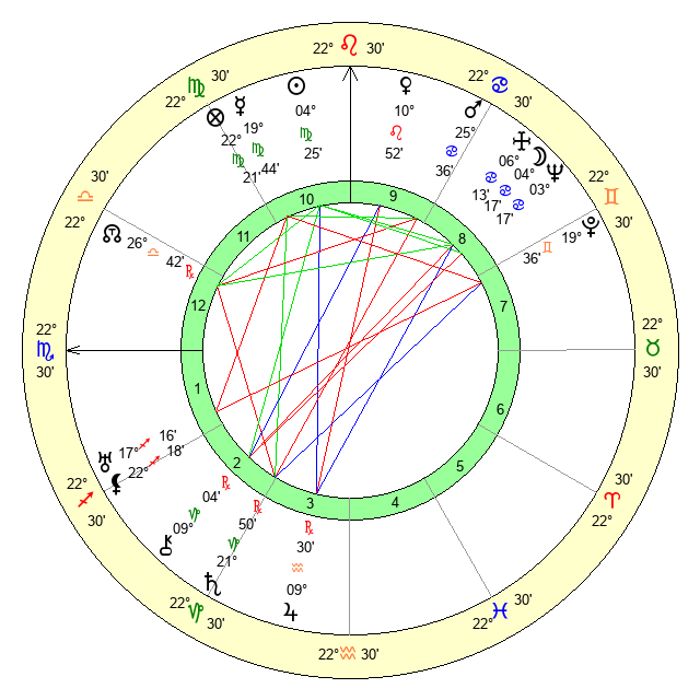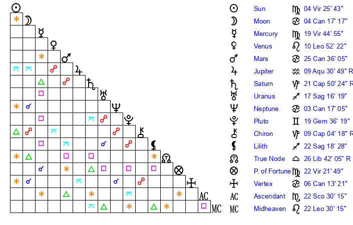 | Mercury | 19 Virgo 45 | 21 Leo 4 | 16 Capricorn 58 |