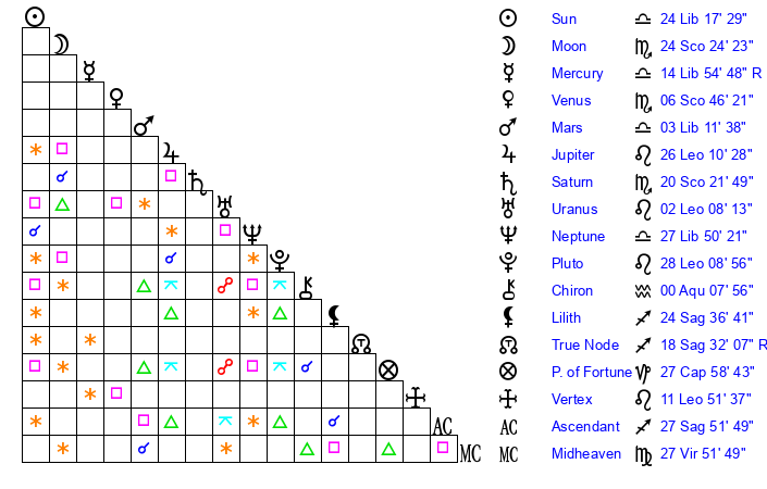 | Moon | 24 Scorpio 25 | 21 Virgo 10 | 10 Gemini 58 |