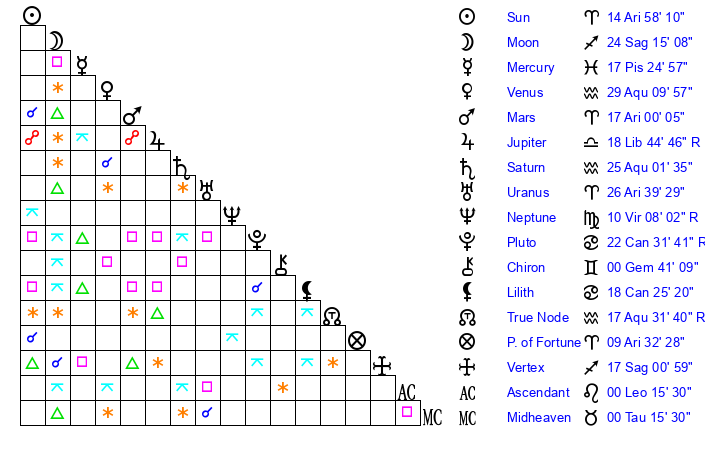 | Sun | 14 Aries 58 | 15 Aries 55 | 12 Cancer 43 |