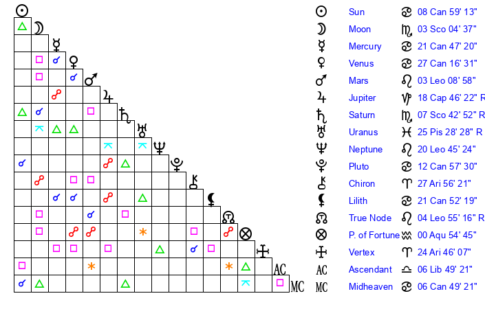 Moon | 2 Scorpio 57 | 23 Virgo 51 | 11 Cancer 19 |