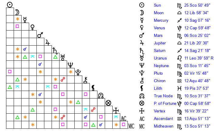 Sun | 25 Scorpio 50 | 26 Scorpio 36 | 3 Aquarius 57 |