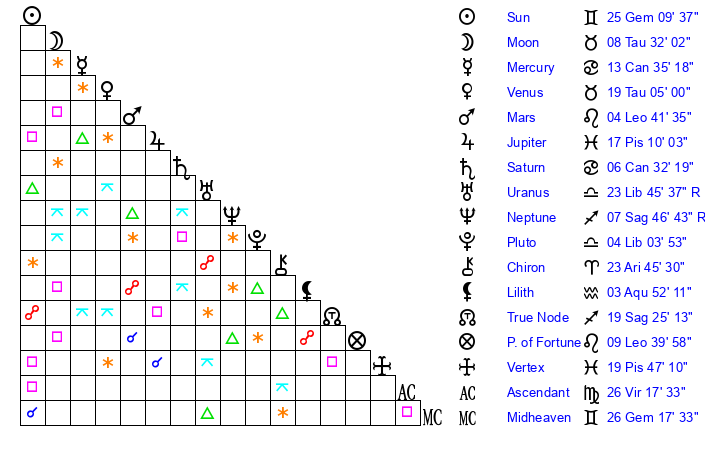 | Sun | 25 Gemini 9 | 25 Gemini 48 | 13 Leo 50 |