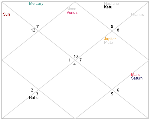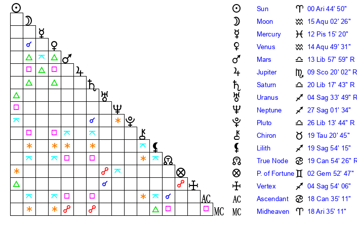 | Venus | 14 Aquarius 50 | 3 Aries 31 | 29 Pisces 6 |