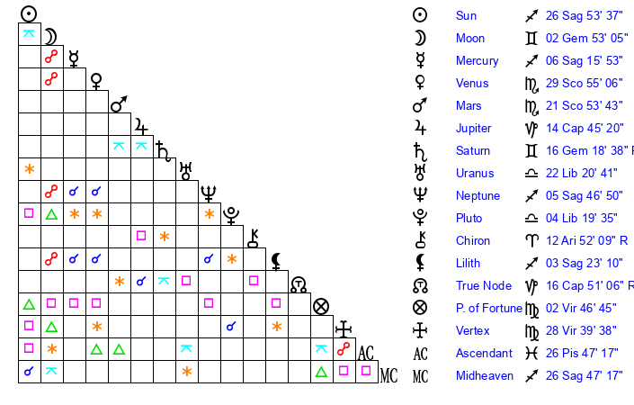 | Neptune | 5 Sagittarius 46 | 29 Pisces 23 | 7 Sagittarius 12 |
