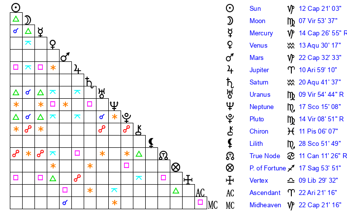 | Pluto | 14 Virgo 9 | 1 Aquarius 8 | 12 Virgo 54 |