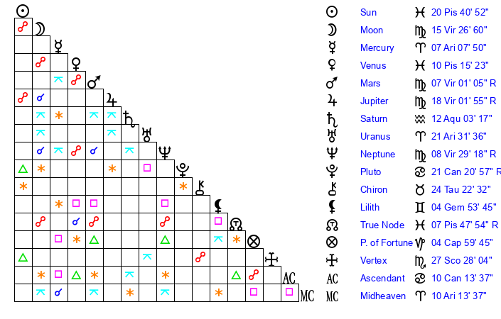 | Neptune | 8 Virgo 28 | 29 Pisces 17 | 7 Virgo 32 |