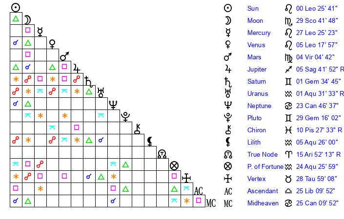 | Mercury | 27 Leo 25 | 14 Leo 21 | 12 Sagittarius 15 |