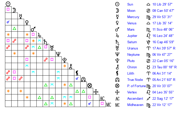 | Venus | 17 Libra 36 | 18 Virgo 38 | 14 Aquarius 44 |