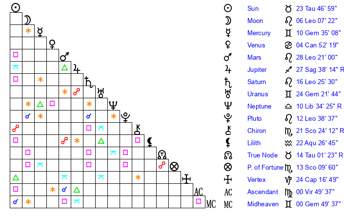 | Moon | 6 Leo 12 | 16 Sagittarius 18 | 24 Taurus 21 |