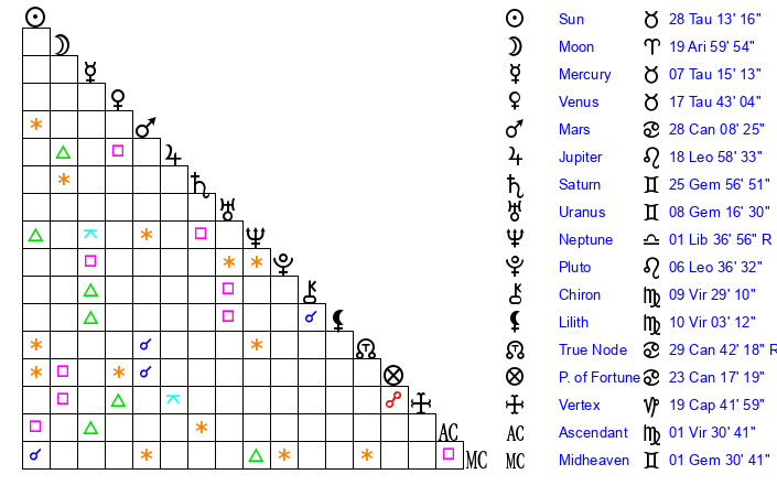 | Neptune | 4 Libra 15 | 27 Pisces 18 | 2 Libra 55 |