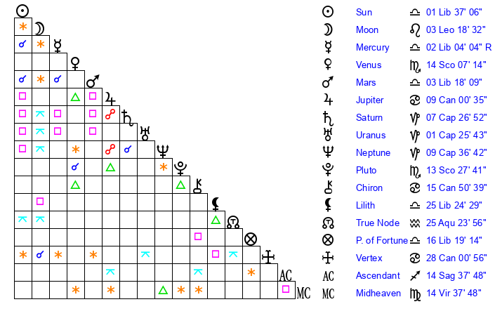 | Moon | 3 Leo 15 | 3 Scorpio 59 | 18 Scorpio 55 |