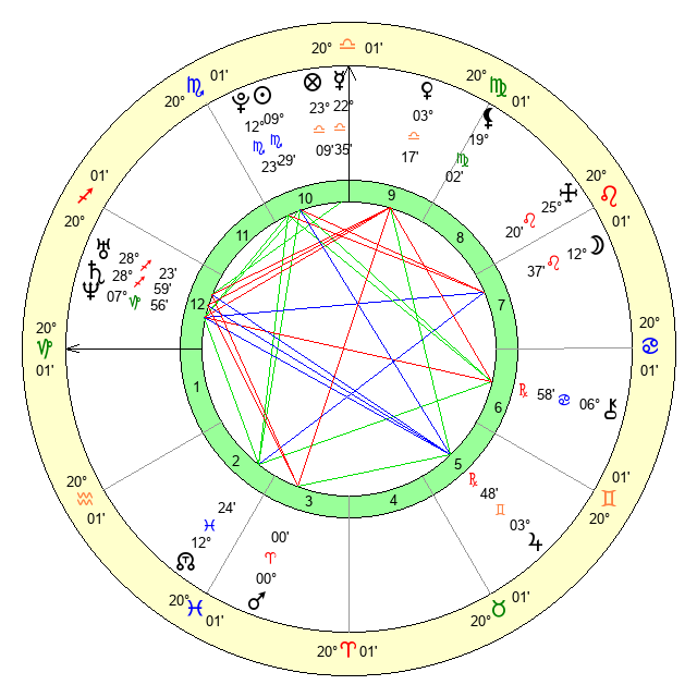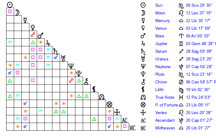 | Moon | 12 Leo 44 | 11 Scorpio 46 | 27 Scorpio 19 |