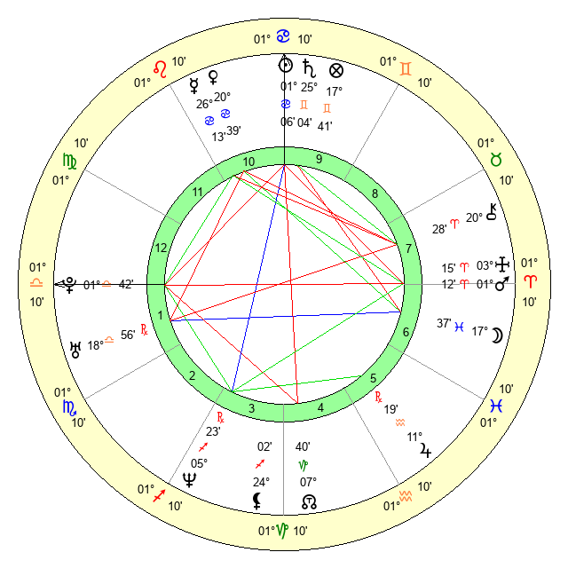 | Sun | 1 Cancer 6 | 1 Cancer 31 | 20 Leo 47 |