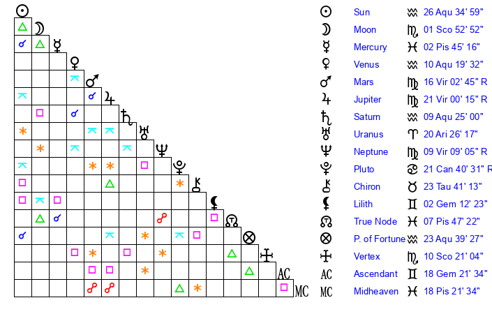 | Moon | 1 Scorpio 50 | 2 Libra 31 | 23 Pisces 17 |