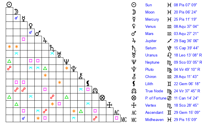 | Moon | 20 Pisces 4 | 4 Pisces 55 | 27 Cancer 25 |