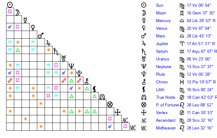 | Moon | 16 Gemini 29 | 24 Aries 19 | 25 Virgo 18 |