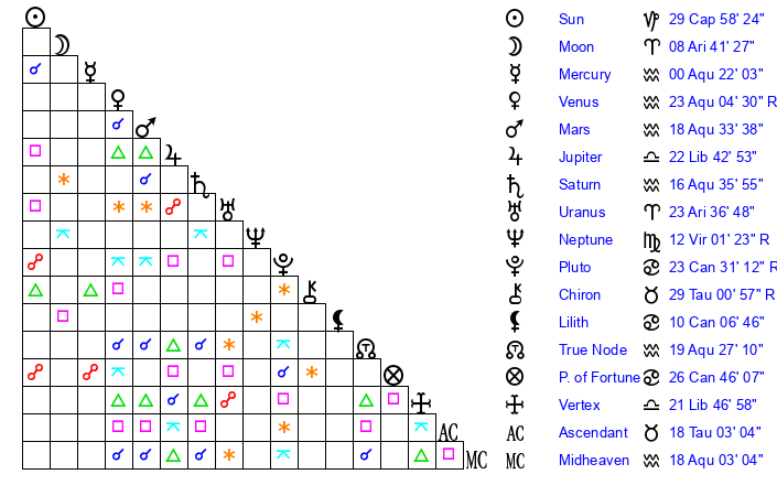 | Mars | 18 Aquarius 34 | 24 Cancer 24 | 29 Aries 18 |