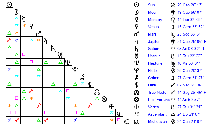 | Jupiter | 21 Capricorn 19 | 9 Cancer 42 | 19 Capricorn 15 |