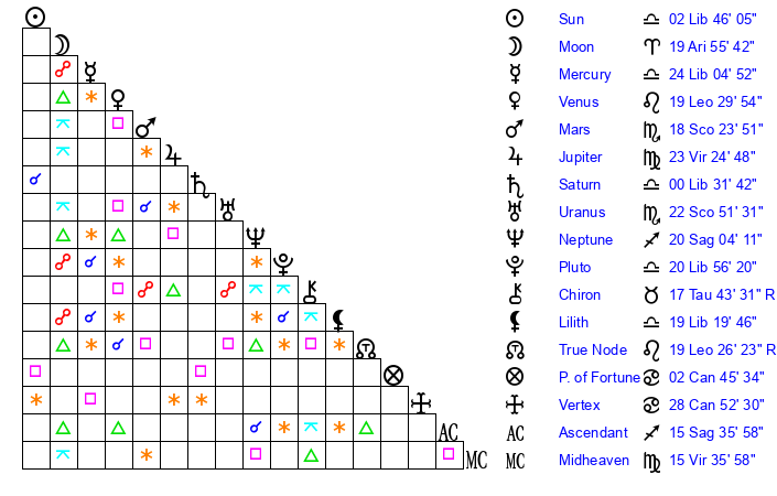 Moon | 19 Aries 47 | 15 Scorpio 55 | 7 Sagittarius 58 |