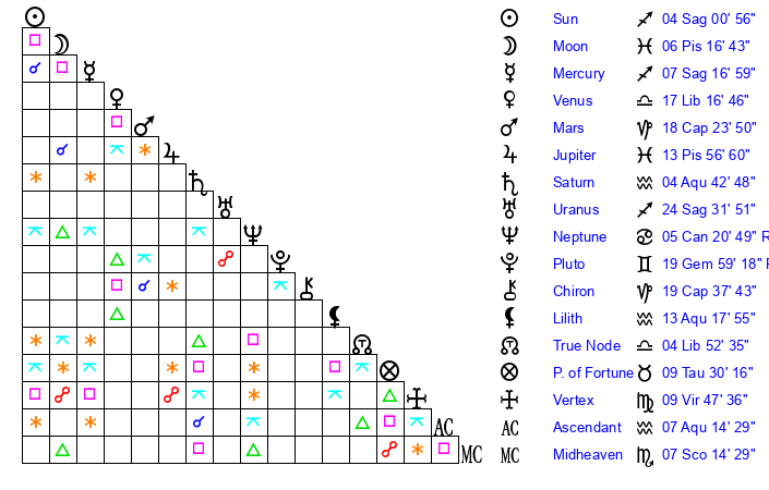 | Uranus | 24 Sagittarius 29 | 29 Taurus 12 | 29 Sagittarius 53 |