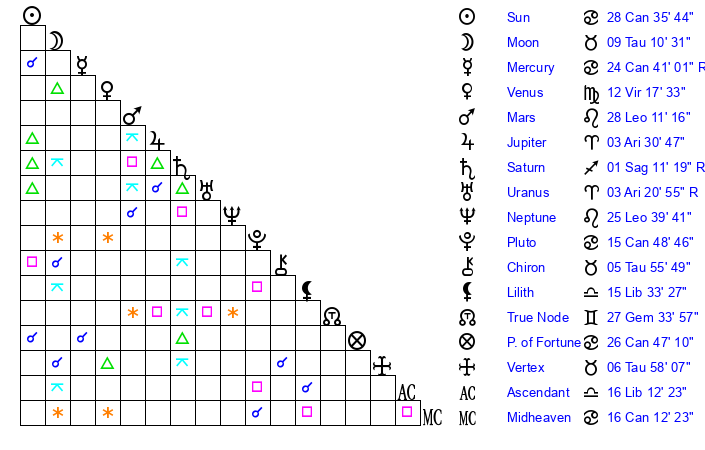 | Moon | 9 Taurus 6 | 28 Gemini 27 | 4 Sagittarius 11 |
