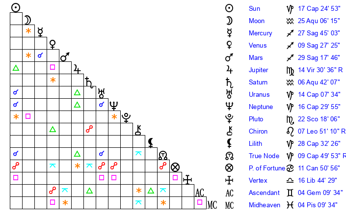 Mercury | 27 Sagittarius 45 | 0 Capricorn 2 | 19 Aquarius 31 |