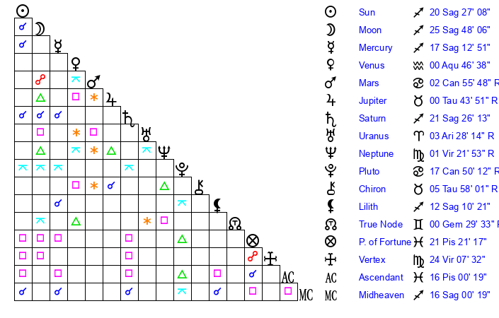 | Mercury | 17 Sagittarius 13 | 0 Sagittarius 57 | 5 Pisces 11 |