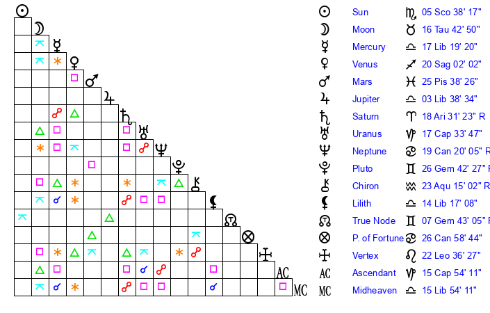 | Sun | 5 Scorpio 38 | 6 Scorpio 31 | 3 Pisces 13 |
