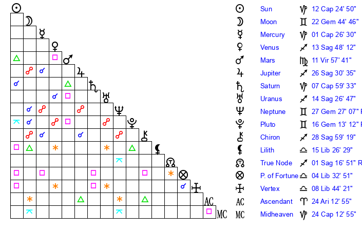 | Jupiter | 26 Sagittarius 18 | 12 Gemini 57 | 12 Capricorn 42 |