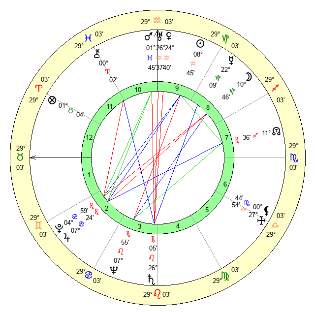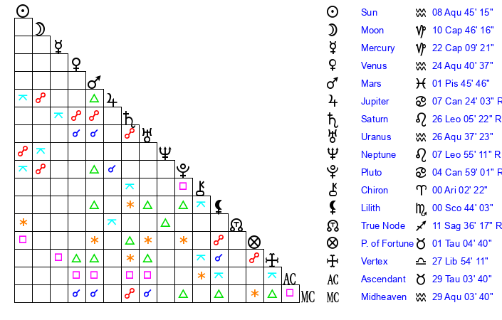 | Sun | 8 Aquarius 45 | 10 Aquarius 2 | 23 Taurus 48 |