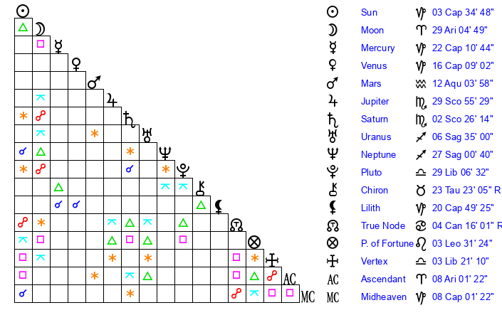 | Mercury | 22 Capricorn 11 | 12 Sagittarius 27 | 20 Capricorn 52 |