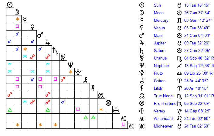 | Moon | 26 Cancer 36 | 28 Leo 42 | 17 Taurus 36 |