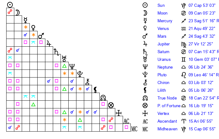 | Sun | 7 Capricorn 53 | 8 Capricorn 29 | 28 Pisces 44 |