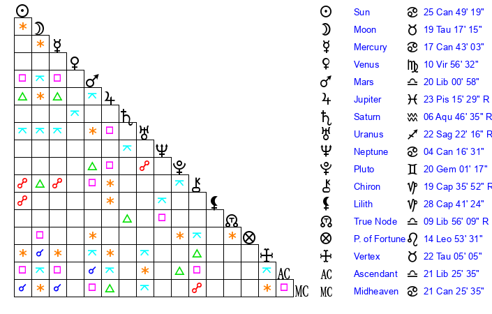 | Sun | 25 Cancer 49 | 27 Cancer 16 | 25 Scorpio 11 |