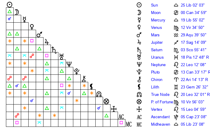 | Sun | 25 Libra 2 | 25 Libra 34 | 7 Aquarius 16 |