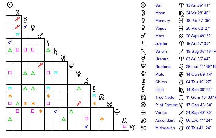 Moon | 24 Virgo 22 | 23 Gemini 9 | 3 Aries 18 |
