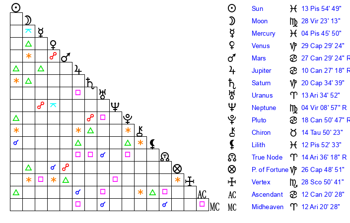 | Moon | 28 Virgo 20 | 29 Taurus 6 | 6 Pisces 57 |