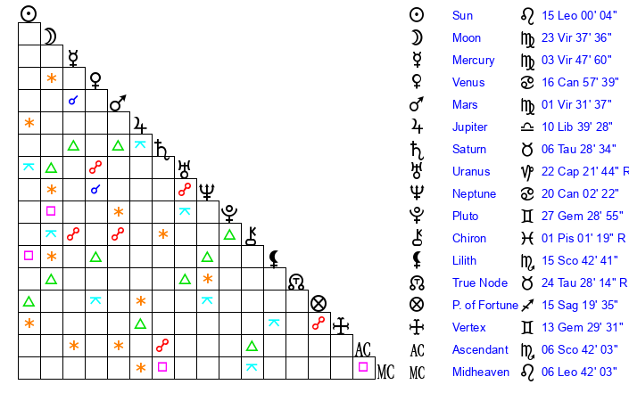 Sun | 15 Leo 0 | 16 Leo 9 | 8 Sagittarius 23 |
