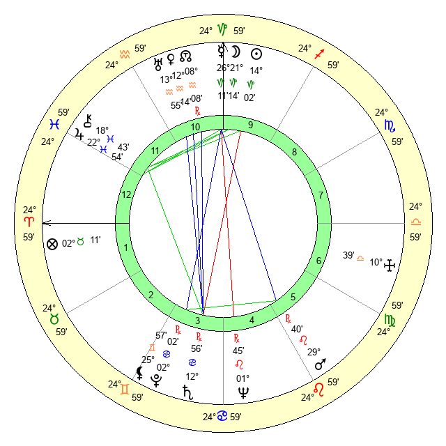 | Neptune | 1 Leo 45 | 27 Pisces 22 | 29 Cancer 55 |