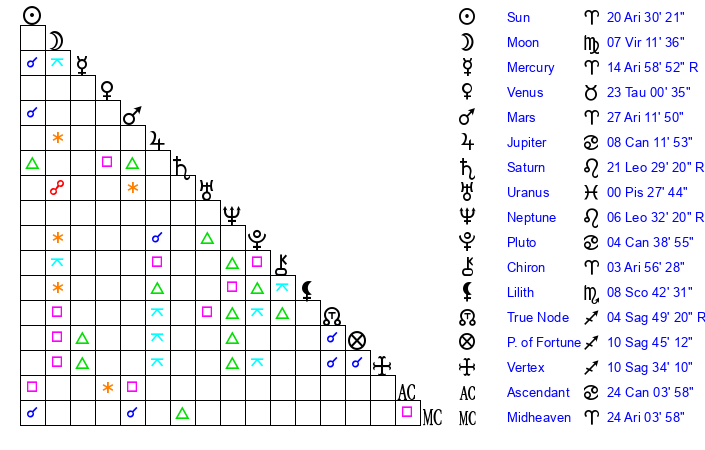 | Mercury | 14 Aries 58 | 27 Pisces 31 | 27 Leo 26 |