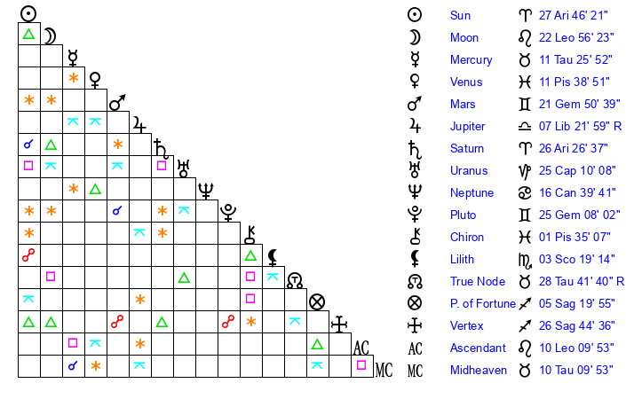 | Sun | 27 Aries 46 | 28 Aries 54 | 18 Leo 7 |