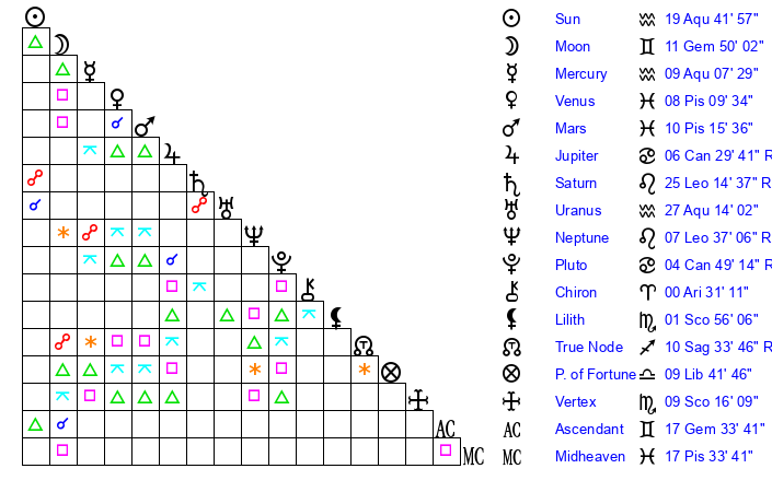 | Sun | 19 Aquarius 42 | 20 Aquarius 59 | 4 Gemini 11 |