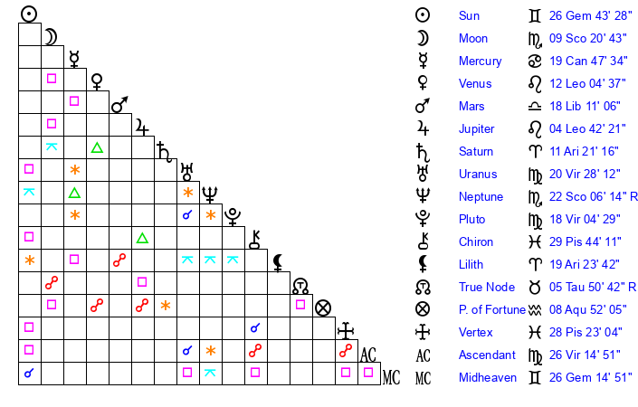 Sun | 26 Gemini 44 | 27 Gemini 40 | 22 Leo 8 |
